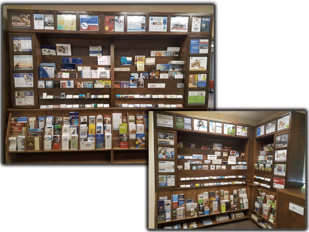 The information and resource display, located in the lobby of the Jacksonville Onslow Chamber of Commerce, was created specifically to help its members get their message out affordably while simultaneously supporting their local Chamber of Commerce.